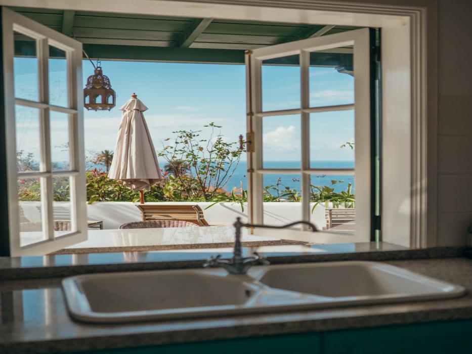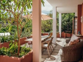 Natursteinhaus am Eukalyptusbaum: Handgeschlagene Steine, Terrasse mit Meerblick, offener Wohnbereich mit Küche, modernes Bad, sowie drei Schlafzimmer im Obergeschoss mit Panoramaterrasse.