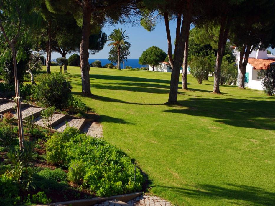 große Rasenflächen, teilweise im Schatten alter Pinien, mit Meerblick